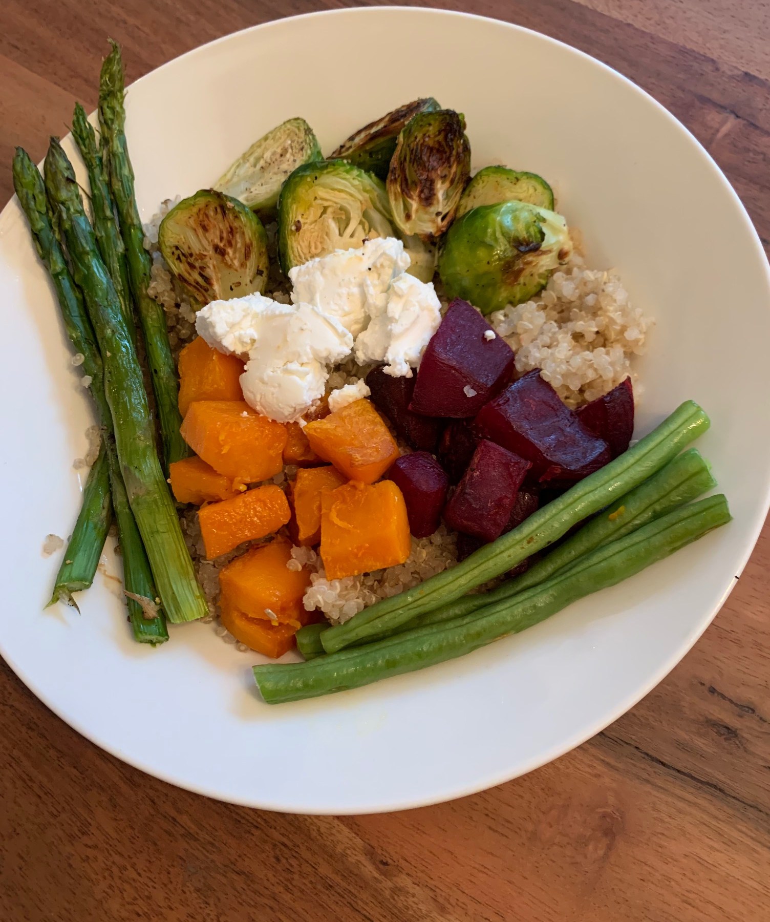 Start with a base of quinoa in your bowl and then add any of your favorite roasted veggies. On hot summer nights, there’s no need to fire up the oven – just throw some veggies on the grill to cook. Or, if you prefer, cook them on a baking sheet in the oven at 400 degrees. Get creative and add lots of colors to boost your nutrient intake. I like butternut squash, beets, Brussles sprouts, cauliflower, green beans, asparagus – anything you can think of! Once the veggies are roasted, simply pile them on top of the quinoa, add a scoop of goat cheese or crumbled feta for an extra kick of flavor and protein.